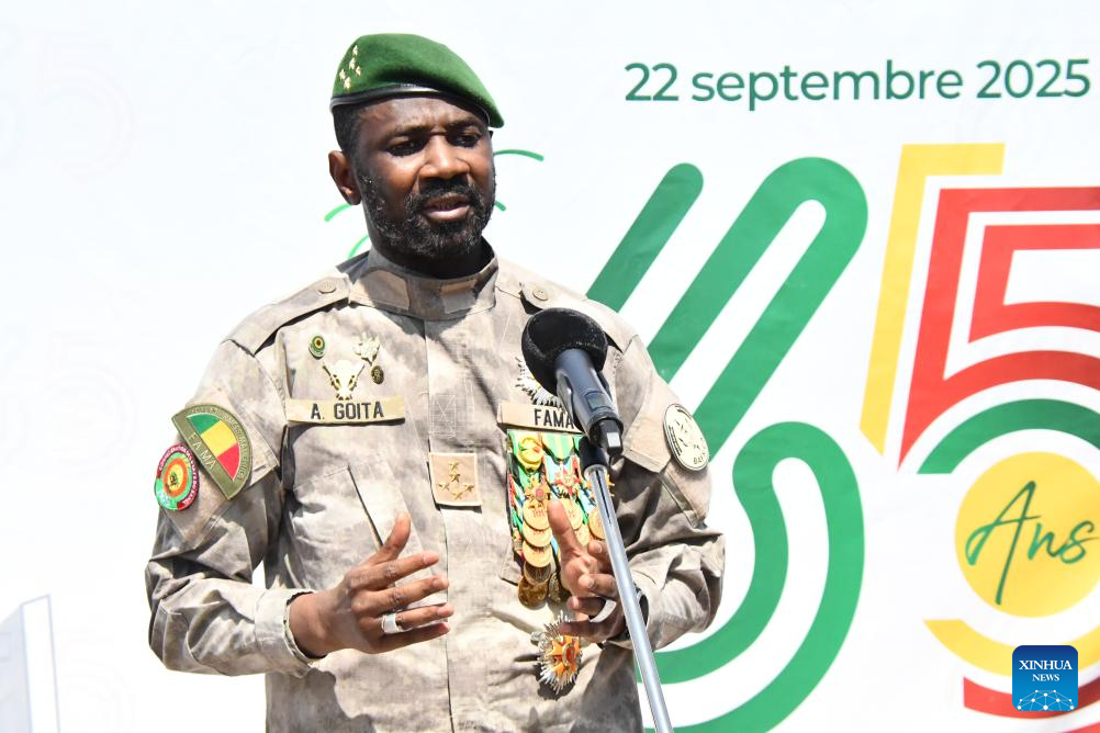 Malian President Assimi Goita speaks during an event marking the 65th anniversary of Mali's independence in Bamako, Mali, on Sept. 22, 2025. Mali celebrated on Monday the 65th anniversary of its independence with a seven-hour civil and military parade, preceded in the morning by a wreath-laying ceremony at the Independence Monument by President Assimi Goita. (Photo by Habib Kouyate/Xinhua)