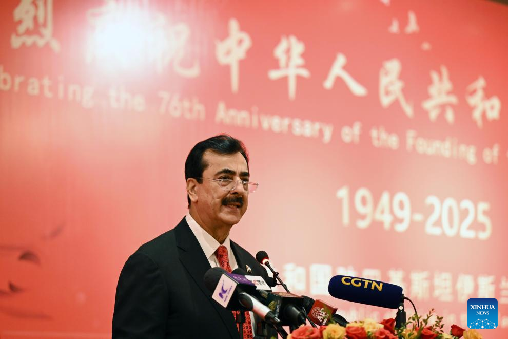 Chairman of the Senate of Pakistan Yousuf Raza Gilani speaks during a reception celebrating the 76th anniversary of the founding of the People's Republic of China, in Islamabad, Pakistan, Sept. 22, 2025. The Global Governance Initiative proposed by China, which aims to promote a fairer global governance system, showcases China's vision for human progress and international harmony, said Chairman of the Senate of Pakistan Yousuf Raza Gilani. (Xinhua/Ahmad Kamal)