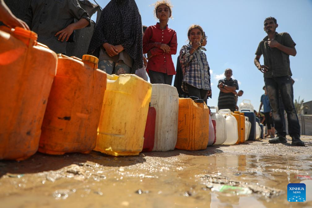 Displaced Palestinian children are seen fetching water at a temporary shelter in Deir al-Balah, in central Gaza Strip, Sept. 23, 2025. (Photo by Rizek Abdeljawad/Xinhua)