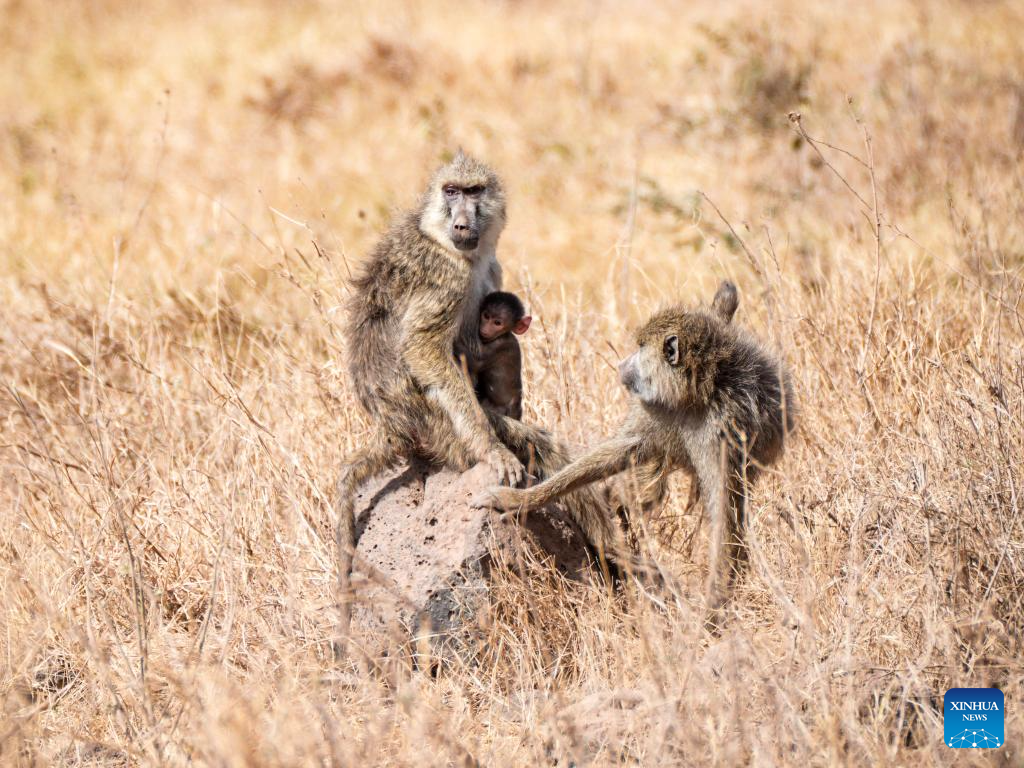 This photo taken on Sept. 20, 2025 shows baboons at Amboseli National Park in Kajiado County, Kenya. Located at the border between Kenya and Tanzania and at the foot of Africa's highest peak Mount Kilimanjaro, the park is known for its unique scenery and is one of the best places in Kenya to see various wild animals. (Xinhua/Li Yahui)