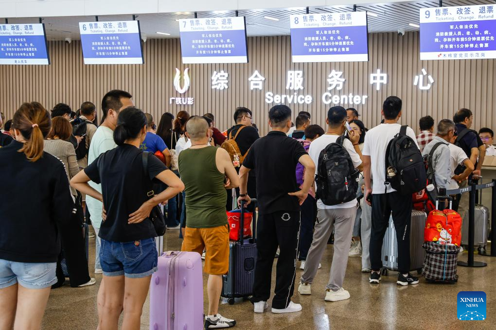 Passengers line up to apply for ticket changes and refunds at the service center of Guangzhou South Railway Station in Guangzhou, south China's Guangdong Province, Sept. 23, 2025. South China's Guangdong Province raised its wind emergency response to the highest level at 10 a.m. Tuesday, as Typhoon Ragasa is forecast to make landfall along the central or western coastal areas of the province as a strong or super strong typhoon within 24 hours.