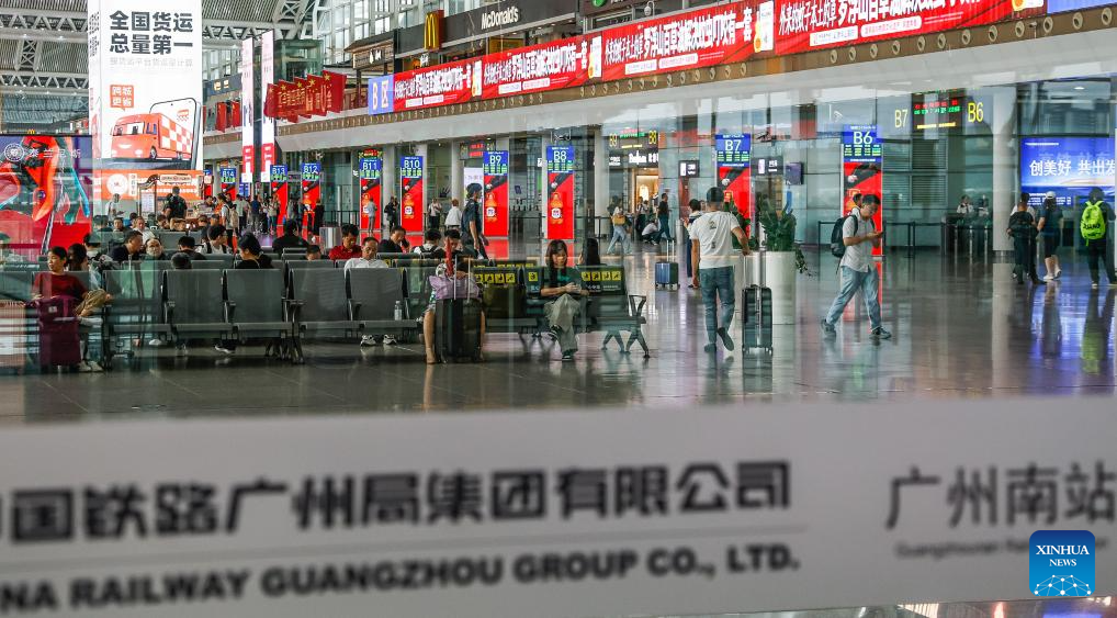 Passengers enter Guangzhou South Railway Station to board train in Guangzhou, south China's Guangdong Province, Sept. 23, 2025. South China's Guangdong Province raised its wind emergency response to the highest level at 10 a.m. Tuesday, as Typhoon Ragasa is forecast to make landfall along the central or western coastal areas of the province as a strong or super strong typhoon within 24 hours.