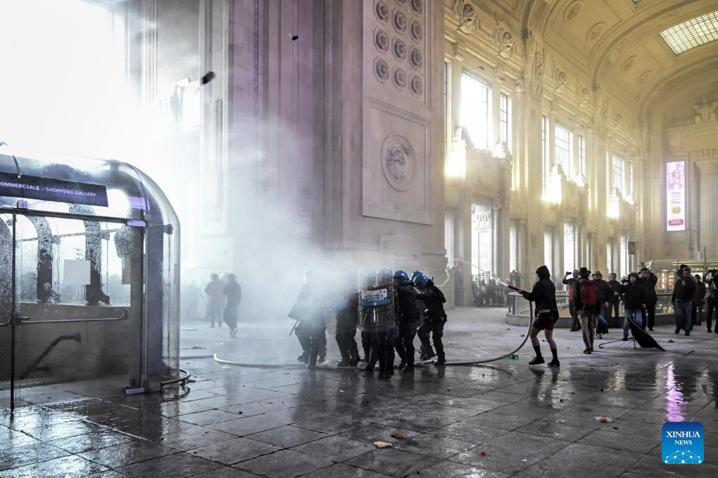Pro-Palestine protesters confront the police in the Central Station in Milan, Italy, Sept. 22, 2025. (Xinhua)