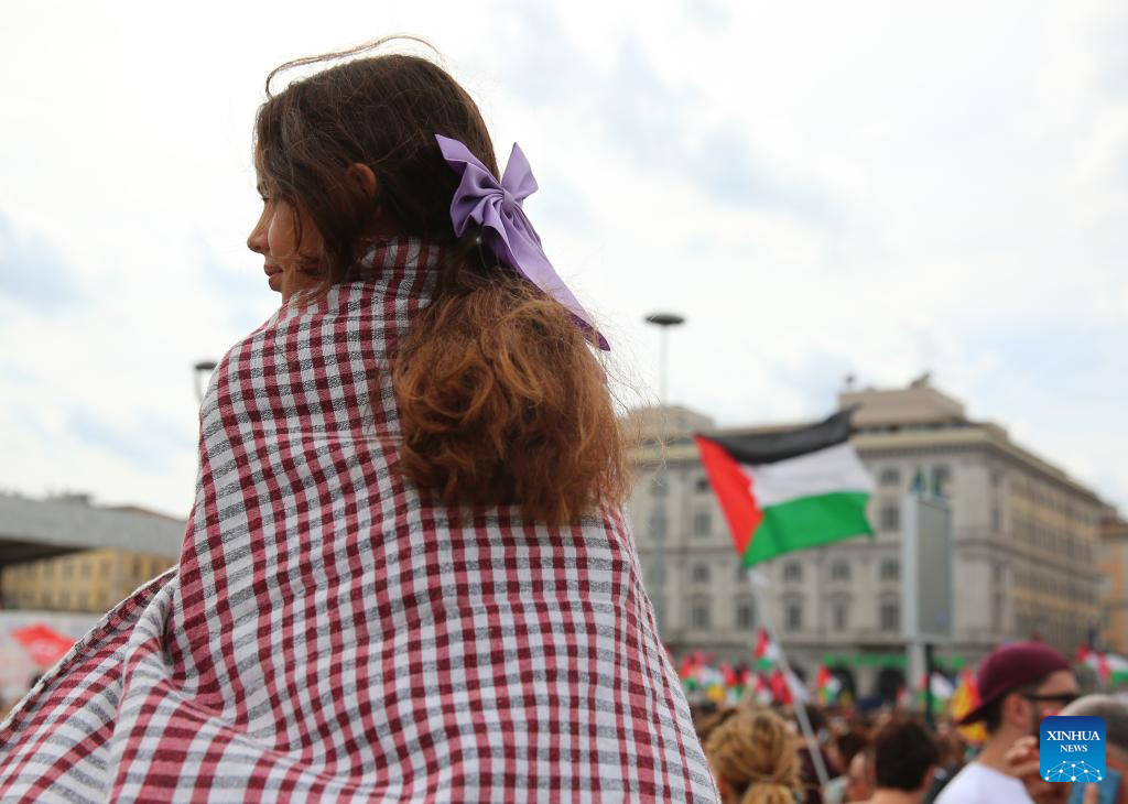A girl participates in a pro-Palestinian protest in Rome, Italy, Sept. 22, 2025. (Xinhua/Li Jing)