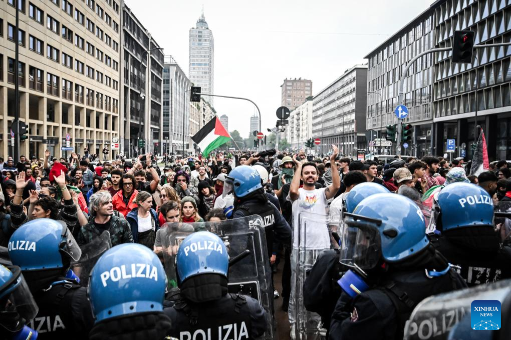 Pro-Palestine protesters confront the police in front of the Central Station in Milan, Italy, Sept. 22, 2025. (Xinhua)