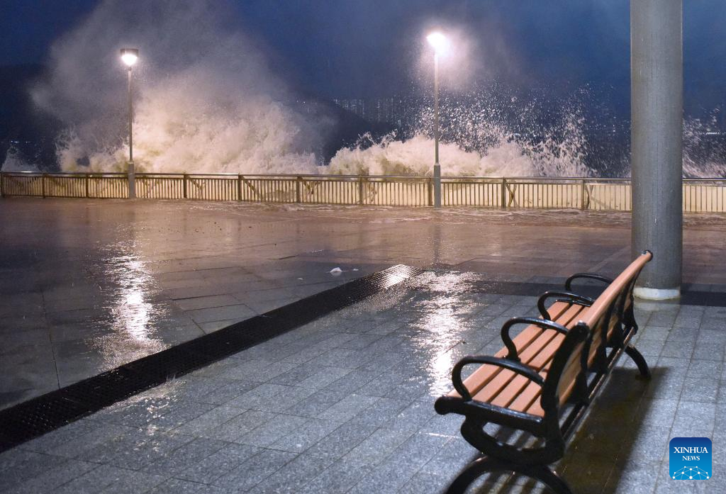 A man takes photos of a wave by a coast in Hong Kong, south China, Sept. 23, 2025. (Xinhua/Chen Duo)