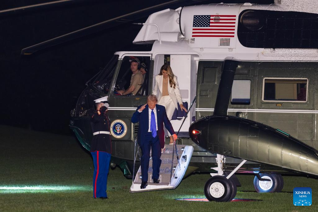U.S. President Donald Trump and First Lady Melania Trump step off Marine One upon arrival at the White House in Washington, D.C., the United States, on Sept. 23, 2025.