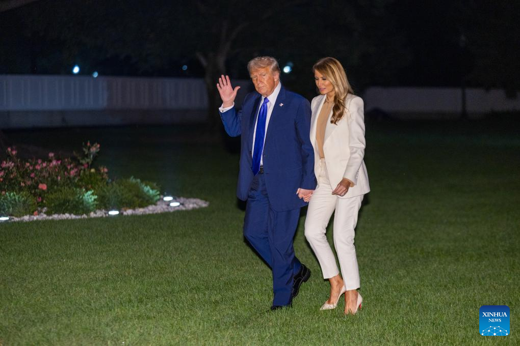 U.S. President Donald Trump and First Lady Melania Trump walk on the South Lawn upon arrival at the White House in Washington, D.C., the United States, on Sept. 23, 2025. U.S. President Donald Trump on Tuesday said on social media that he believes Ukraine, with support from Europe and NATO, "is in a position to fight and WIN all of Ukraine back in its original form." (Xinhua/Hu Yousong)