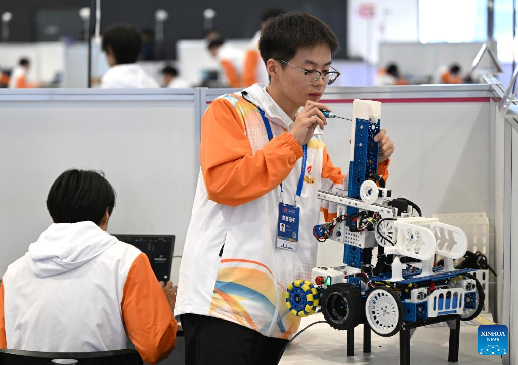 Contestants participate in an autonomous mobile robot event during the third Vocational Skills Competition in Zhengzhou, central China's Henan Province, Sept. 20, 2025.