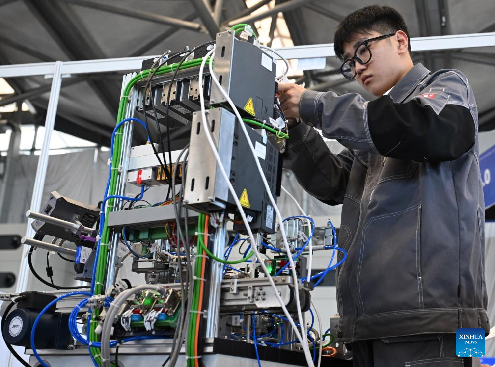 A contestant participates in an industry 4.0 event during the third Vocational Skills Competition in Zhengzhou, central China's Henan Province, Sept. 20, 2025.