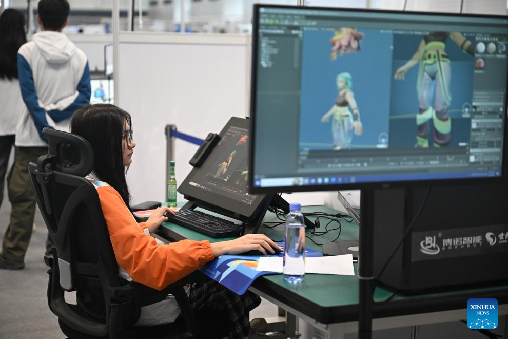 A contestant participates in an art designing for 3D digital gaming event during the third Vocational Skills Competition in Zhengzhou, central China's Henan Province, Sept. 21, 2025.