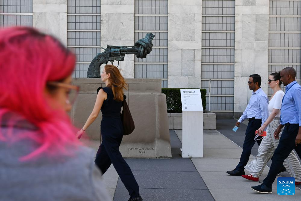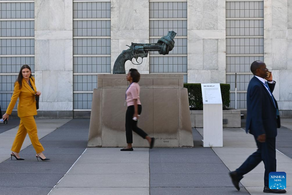 People walk past a sculpture titled "Non-Violence" at the United Nations headquarters in New York, Sept. 18, 2025. This year marks the 80th anniversary of the founding of the United Nations. (Xinhua/Li Rui)