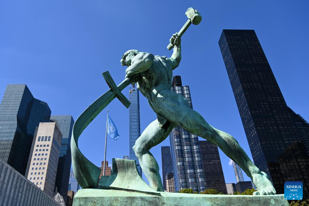 This photo taken on Sept. 18, 2025 shows a sculpture titled "Let Us Beat Swords Into Ploughshares" at the United Nations headquarters in New York. This year marks the 80th anniversary of the founding of the United Nations. (Xinhua/Li Rui)