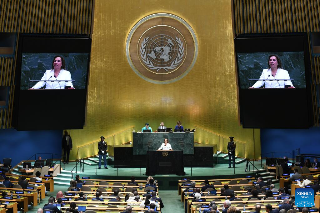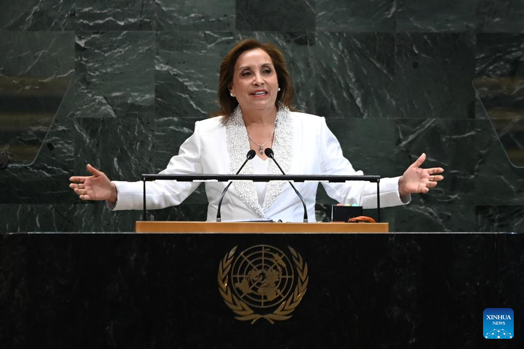 Peruvian President Dina Boluarte delivers a speech during the General Debate of the 80th session of the United Nations General Assembly (UNGA) at the UN headquarters in New York, Sept. 23, 2025. (Xinhua/Li Rui)