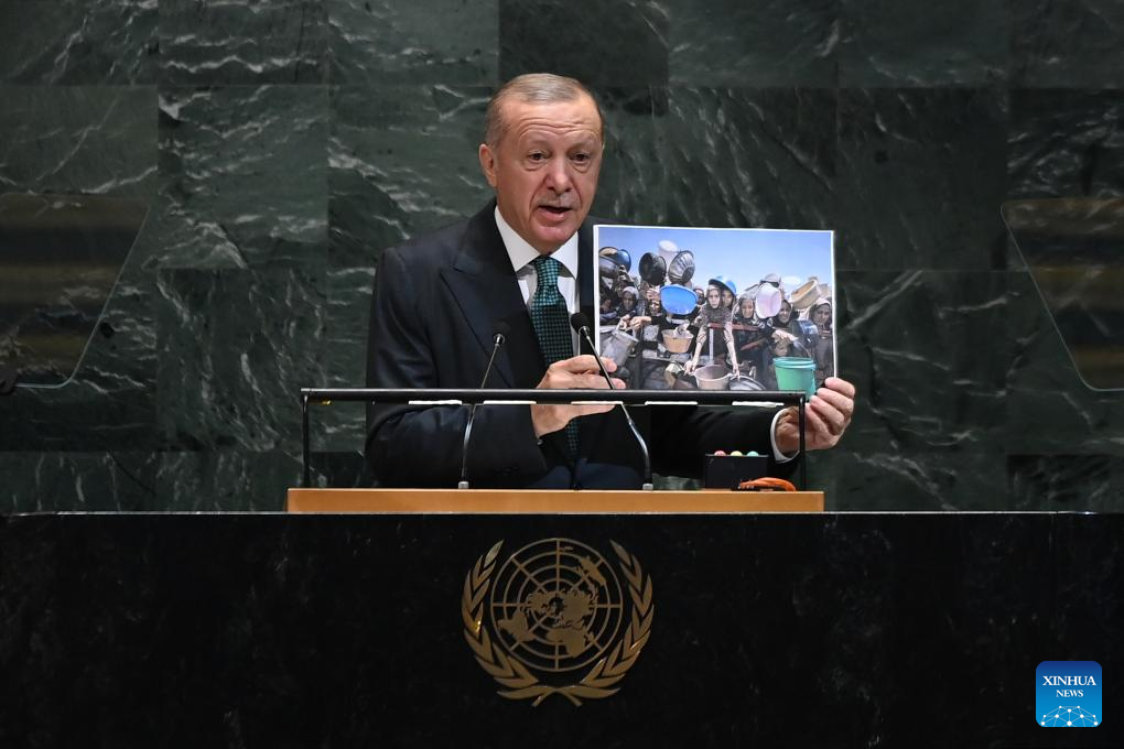 Turkish President Recep Tayyip Erdogan displays a picture from Gaza as he delivers a speech during the General Debate of the 80th session of the United Nations General Assembly (UNGA) at the UN headquarters in New York, Sept. 23, 2025. (Xinhua/Li Rui)