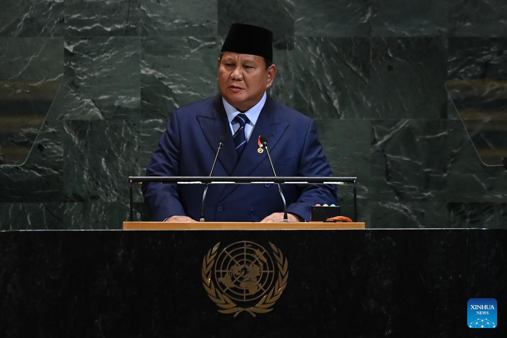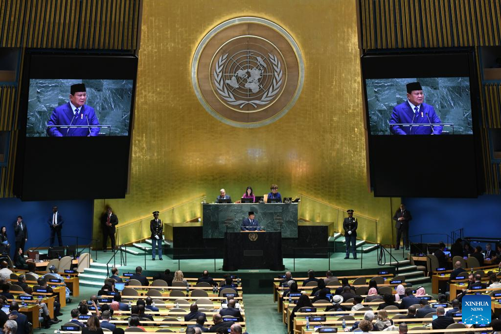Indonesian President Prabowo Subianto delivers a speech during the General Debate of the 80th session of the United Nations General Assembly (UNGA) at the UN headquarters in New York, Sept. 23, 2025. (Xinhua/Li Rui)