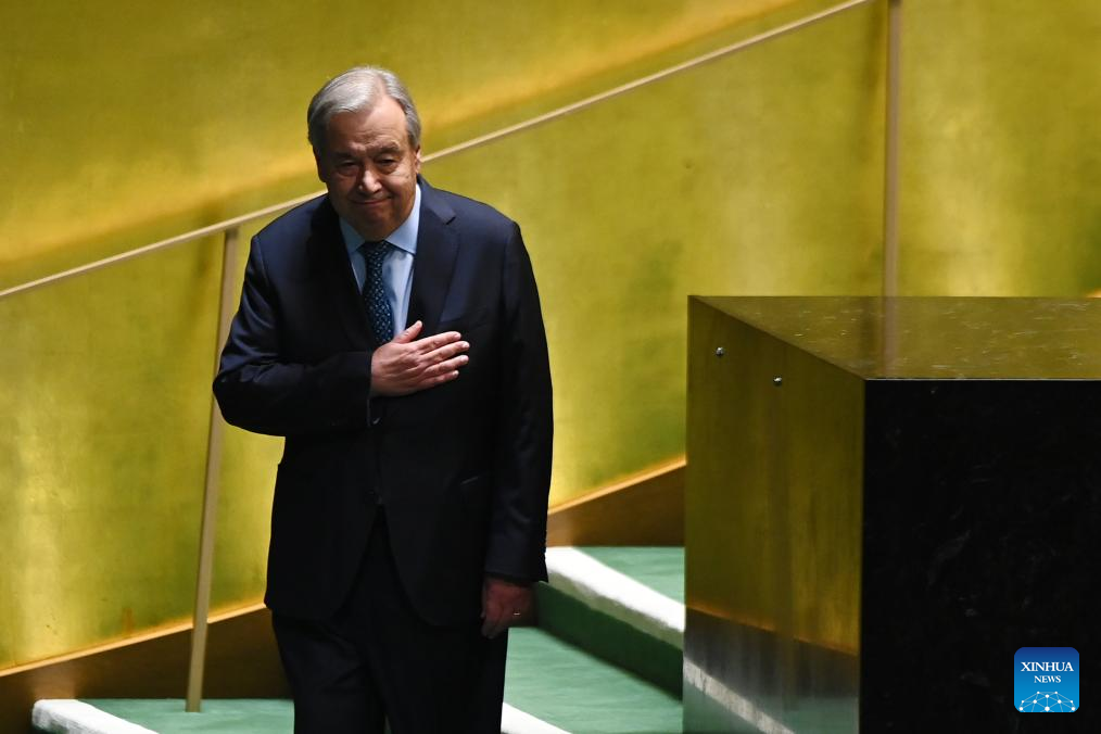 UN Secretary-General Antonio Guterres gestures after delivering a speech at the opening ceremony of the General Debate of the 80th session of the United Nations General Assembly (UNGA) at the UN headquarters in New York, Sept. 23, 2025. Representatives from United Nations (UN) member states, including some 150 heads of state and government, will take turns at the podium of the UN General Assembly (UNGA) to deliver an address on global issues during the UNGA general debate that kicked off on Tuesday. (Xinhua/Li Rui)