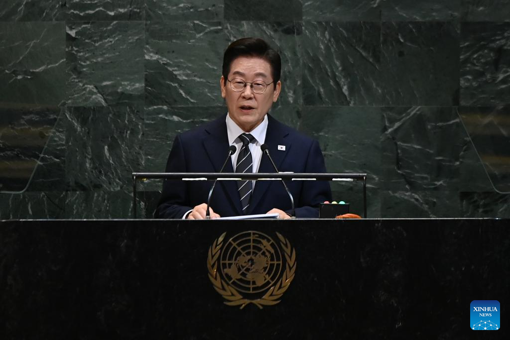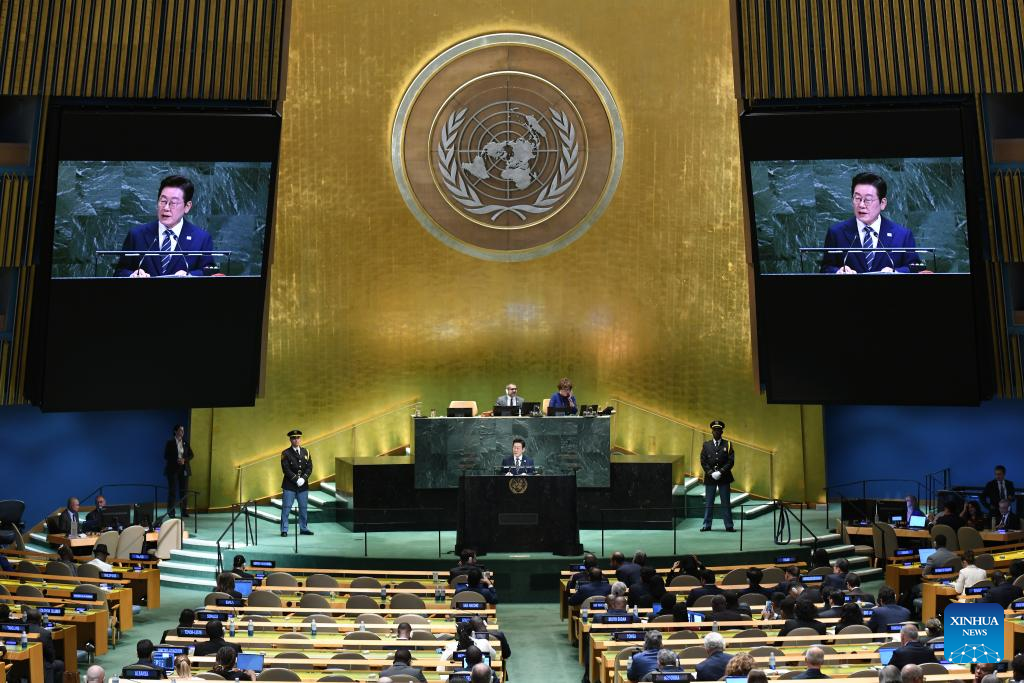 South Korean President Lee Jae-myung delivers a speech during the General Debate of the 80th session of the United Nations General Assembly (UNGA) at the UN headquarters in New York, Sept. 23, 2025. (Xinhua/Li Rui)
