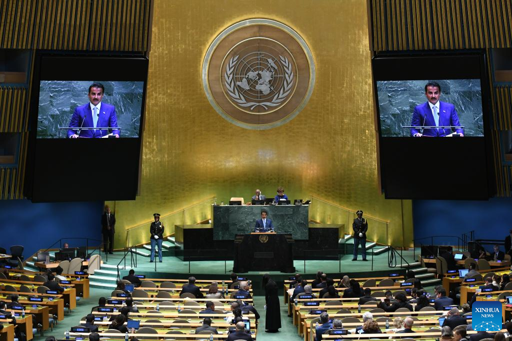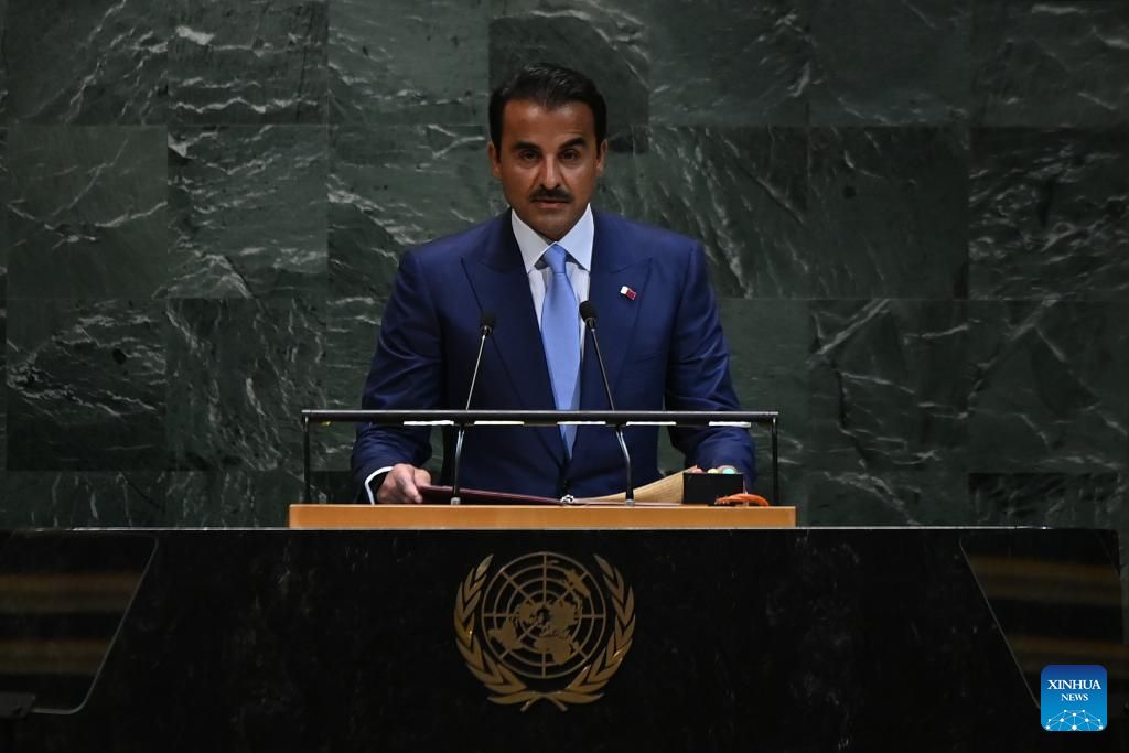 Qatari Emir Sheikh Tamim bin Hamad Al Thani delivers a speech during the General Debate of the 80th session of the United Nations General Assembly (UNGA) at the UN headquarters in New York, Sept. 23, 2025. (Xinhua/Li Rui)