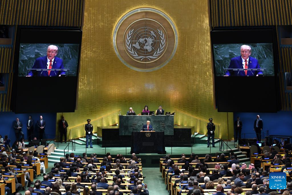 U.S. President Donald Trump delivers a speech during the General Debate of the 80th session of the United Nations General Assembly (UNGA) at the UN headquarters in New York, Sept. 23, 2025. Representatives from United Nations (UN) member states, including some 150 heads of state and government, will take turns at the podium of the UN General Assembly (UNGA) to deliver an address on global issues during the UNGA general debate that kicked off on Tuesday. (Xinhua/Wu Xiaoling)