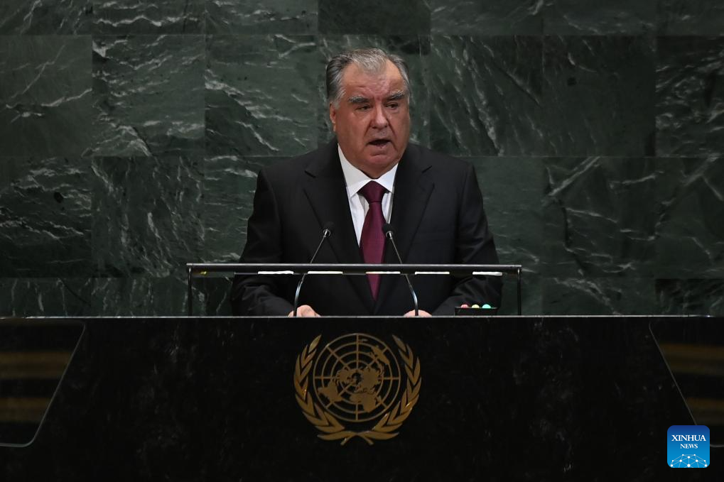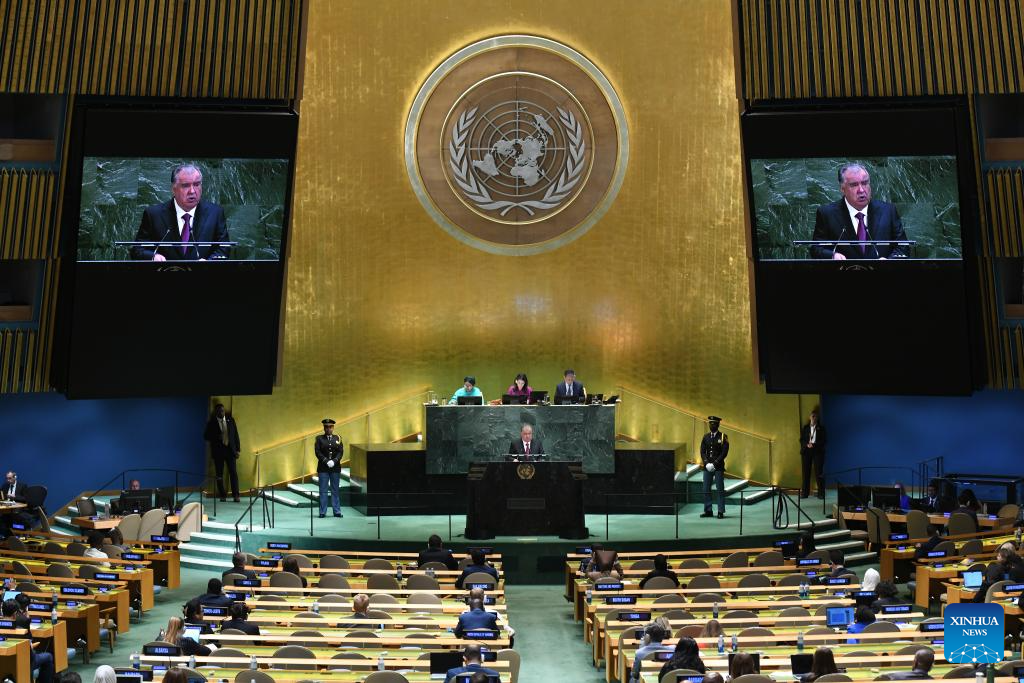 (250923) -- UNITED NATIONS, Sept. 23, 2025 (Xinhua) -- Tajik President Emomali Rahmon delivers a speech during the General Debate of the 80th session of the United Nations General Assembly (UNGA) at the UN headquarters in New York, Sept. 23, 2025. (Xinhua/Li Rui)