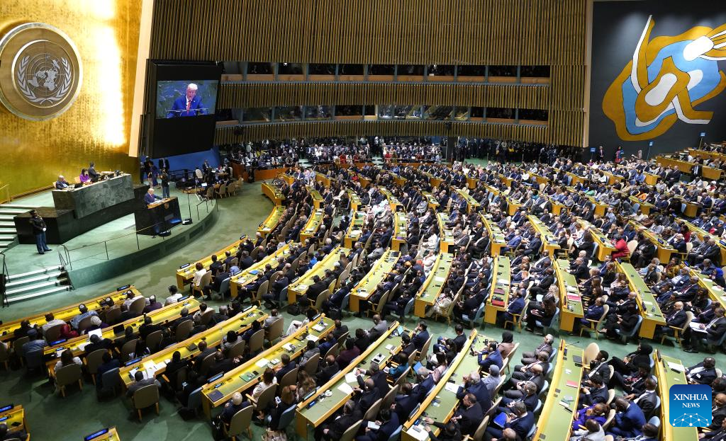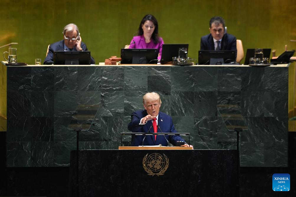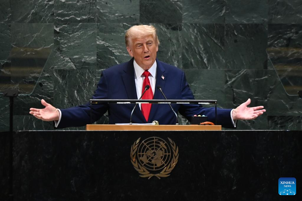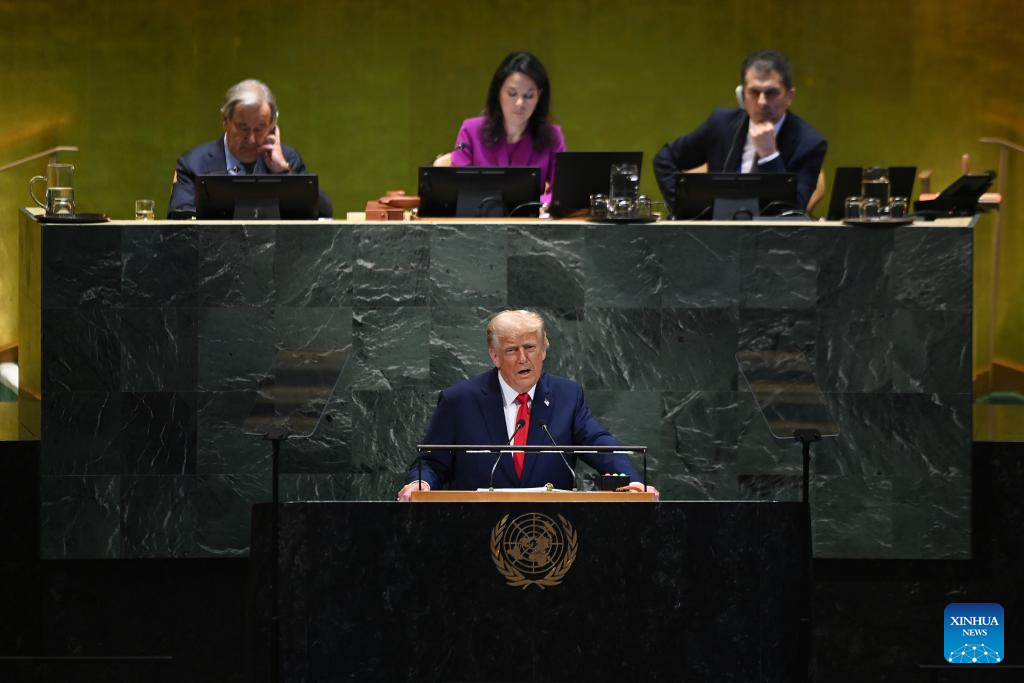 U.S. President Donald Trump delivers a speech during the General Debate of the 80th session of the United Nations General Assembly (UNGA) at the UN headquarters in New York, Sept. 23, 2025. Representatives from United Nations (UN) member states, including some 150 heads of state and government, will take turns at the podium of the UN General Assembly (UNGA) to deliver an address on global issues during the UNGA general debate that kicked off on Tuesday. (Xinhua/Li Rui)