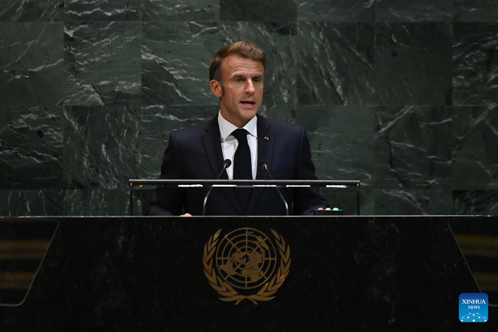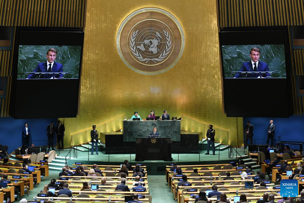 (250923) -- UNITED NATIONS, Sept. 23, 2025 (Xinhua) -- French President Emmanuel Macron delivers a speech during the General Debate of the 80th session of the United Nations General Assembly (UNGA) at the UN headquarters in New York, Sept. 23, 2025. (Xinhua/Li Rui)