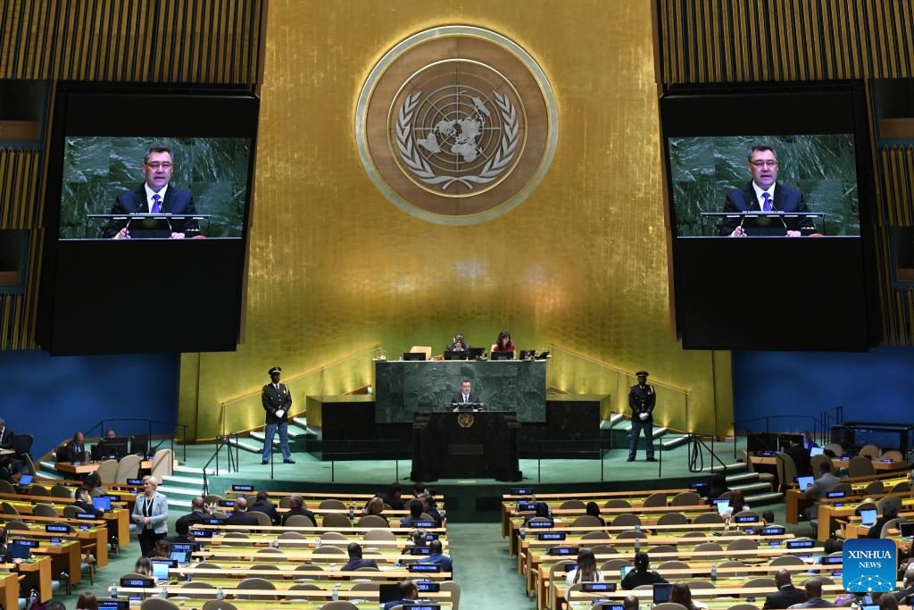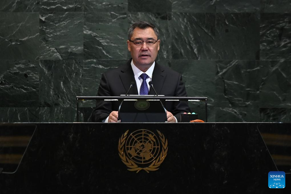 (250923) -- UNITED NATIONS, Sept. 23, 2025 (Xinhua) -- Kyrgyz President Sadyr Zhaparov delivers a speech during the General Debate of the 80th session of the United Nations General Assembly (UNGA) at the UN headquarters in New York, Sept. 23, 2025. (Xinhua/Li Rui)