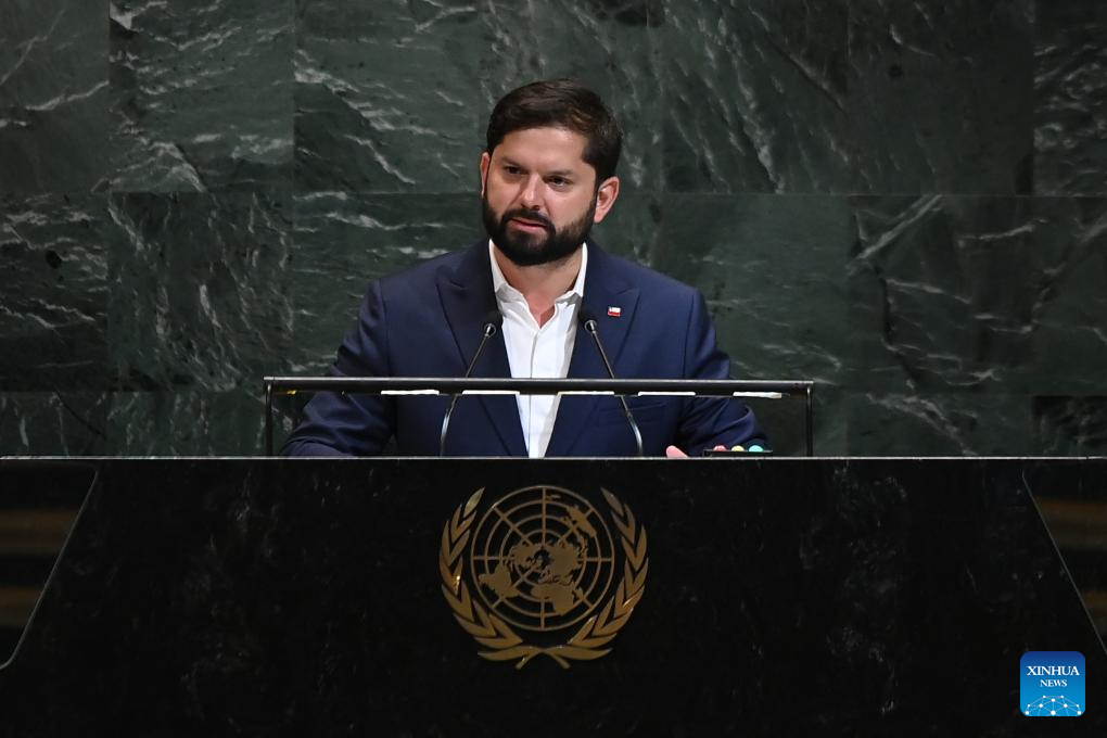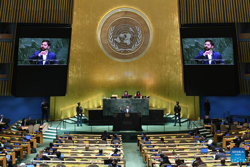 (250923) -- UNITED NATIONS, Sept. 23, 2025 (Xinhua) -- Chilean President Gabriel Boric delivers a speech during the General Debate of the 80th session of the United Nations General Assembly (UNGA) at the UN headquarters in New York, Sept. 23, 2025. (Xinhua/Li Rui)