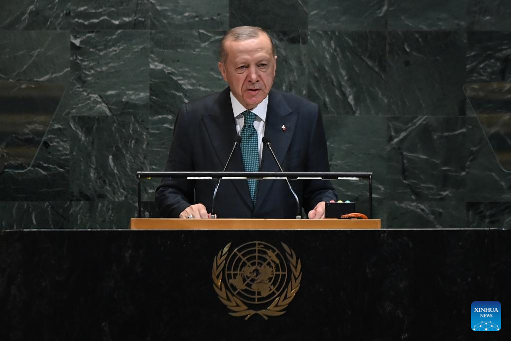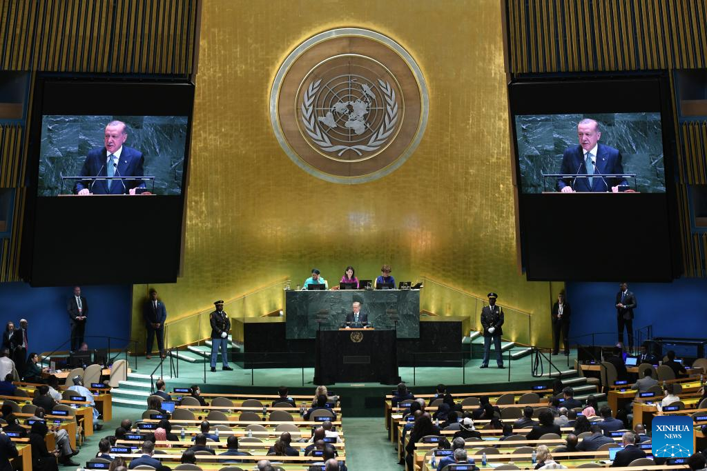 Turkish President Recep Tayyip Erdogan delivers a speech during the General Debate of the 80th session of the United Nations General Assembly (UNGA) at the UN headquarters in New York, Sept. 23, 2025. (Xinhua/Li Rui)