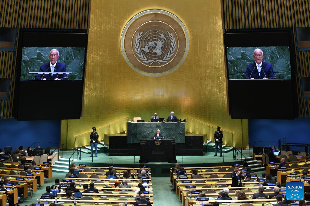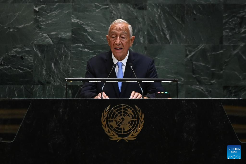 Portuguese President Marcelo Rebelo de Sousa delivers a speech during the General Debate of the 80th session of the United Nations General Assembly (UNGA) at the UN headquarters in New York, Sept. 23, 2025. (Xinhua/Li Rui)