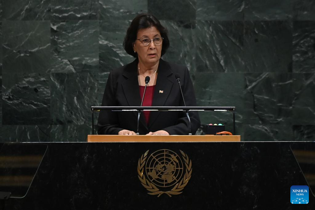 Surinamese President Jennifer Simons delivers a speech during the General Debate of the 80th session of the United Nations General Assembly (UNGA) at the UN headquarters in New York, Sept. 23, 2025. (Xinhua/Li Rui)
