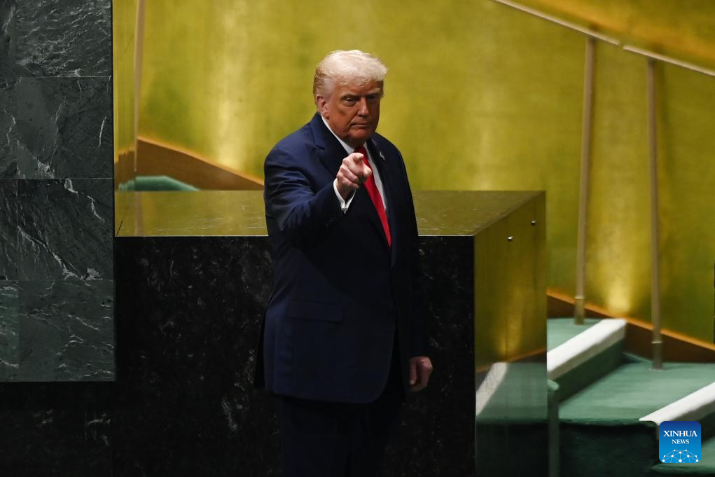 U.S. President Donald Trump gestures after delivering a speech during the General Debate of the 80th session of the United Nations General Assembly (UNGA) at the UN headquarters in New York, on Sept. 23, 2025. Representatives from United Nations (UN) member states, including some 150 heads of state and government, will take turns at the podium of the UN General Assembly (UNGA) to deliver an address on global issues during the UNGA general debate that kicked off on Tuesday. (Xinhua/Li Rui)