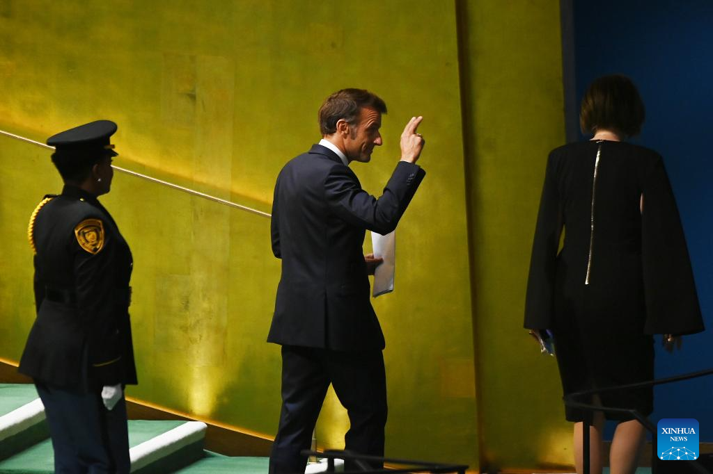 French President Emmanuel Macron (C) gestures as he leaves after delivering a speech during the General Debate of the 80th session of the United Nations General Assembly (UNGA) at the UN headquarters in New York, Sept. 23, 2025. (Xinhua/Li Rui)