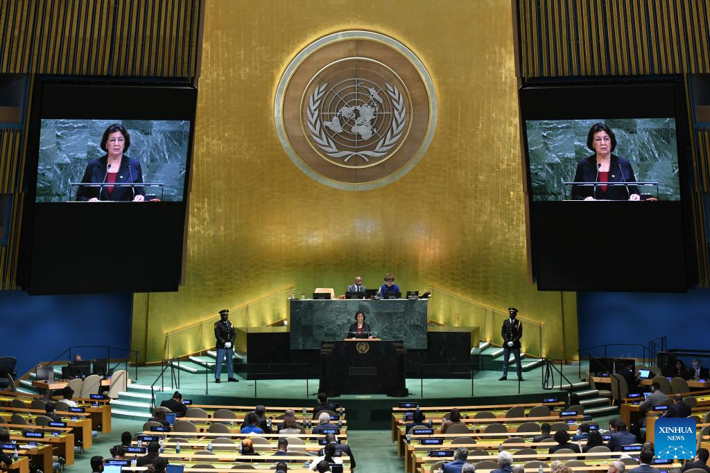 United Nations General Assembly President Annalena Baerbock (C) strikes the gavel to begin the General Debate of the 80th session of the United Nations General Assembly (UNGA) at the UN headquarters in New York, Sept. 23, 2025. Representatives from United Nations (UN) member states, including some 150 heads of state and government, will take turns at the podium of the UN General Assembly (UNGA) to deliver an address on global issues during the UNGA general debate that kicked off on Tuesday. (Xinhua/Wu Xiaoling)