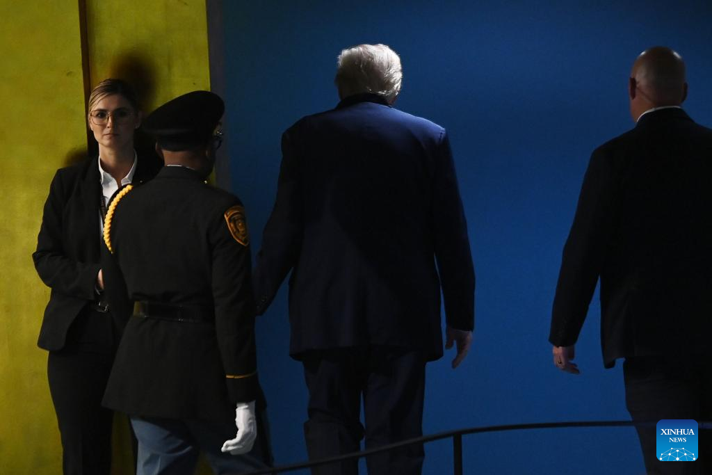 U.S. President Donald Trump (2nd R) leaves after delivering a speech during the General Debate of the 80th session of the United Nations General Assembly (UNGA) at the UN headquarters in New York, on Sept. 23, 2025. Representatives from United Nations (UN) member states, including some 150 heads of state and government, will take turns at the podium of the UN General Assembly (UNGA) to deliver an address on global issues during the UNGA general debate that kicked off on Tuesday. (Xinhua/Li Rui)