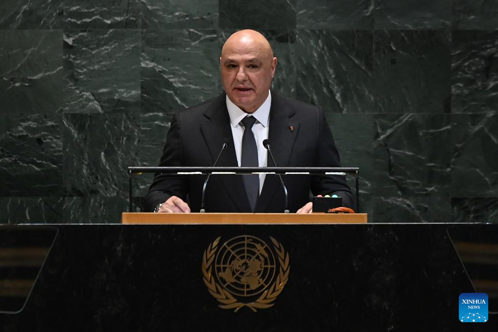(250923) -- UNITED NATIONS, Sept. 23, 2025 (Xinhua) -- Lebanese President Joseph Aoun delivers a speech during the General Debate of the 80th session of the United Nations General Assembly (UNGA) at the UN headquarters in New York, Sept. 23, 2025. (Xinhua/Li Rui)