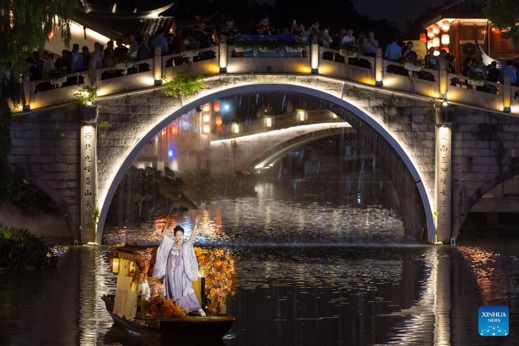 A performance is staged at the Qibao Ancient Town in Minhang District of east China's Shanghai, Sept. 22, 2025.
