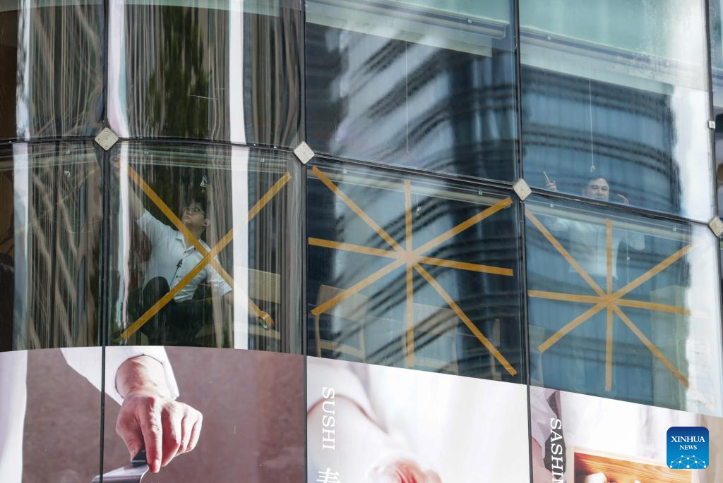 A staff member sticks adhesive strips on windows of a shopping mall in Shenzhen, south China's Guangdong Province, Sept. 23, 2025.