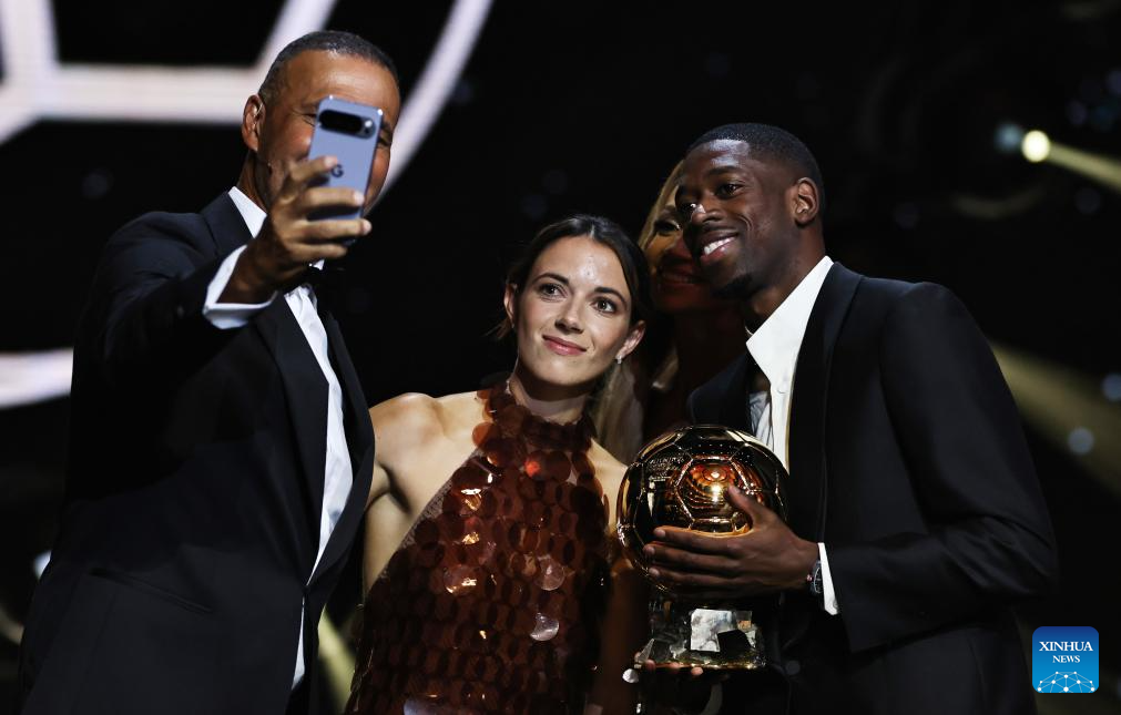 Paris Saint-Germain's French forward Ousmane Dembele (1st R) and Barcelona's Spanish player Aitana Bonmati (2nd L) take a selfie after winning the men's and women's Ballon d'Or awards during the 2025 Ballon d'Or France Football award ceremony at the Theatre du Chatelet in Paris, France, on Sept. 22, 2025. (Xinhua/Gao Jing)
