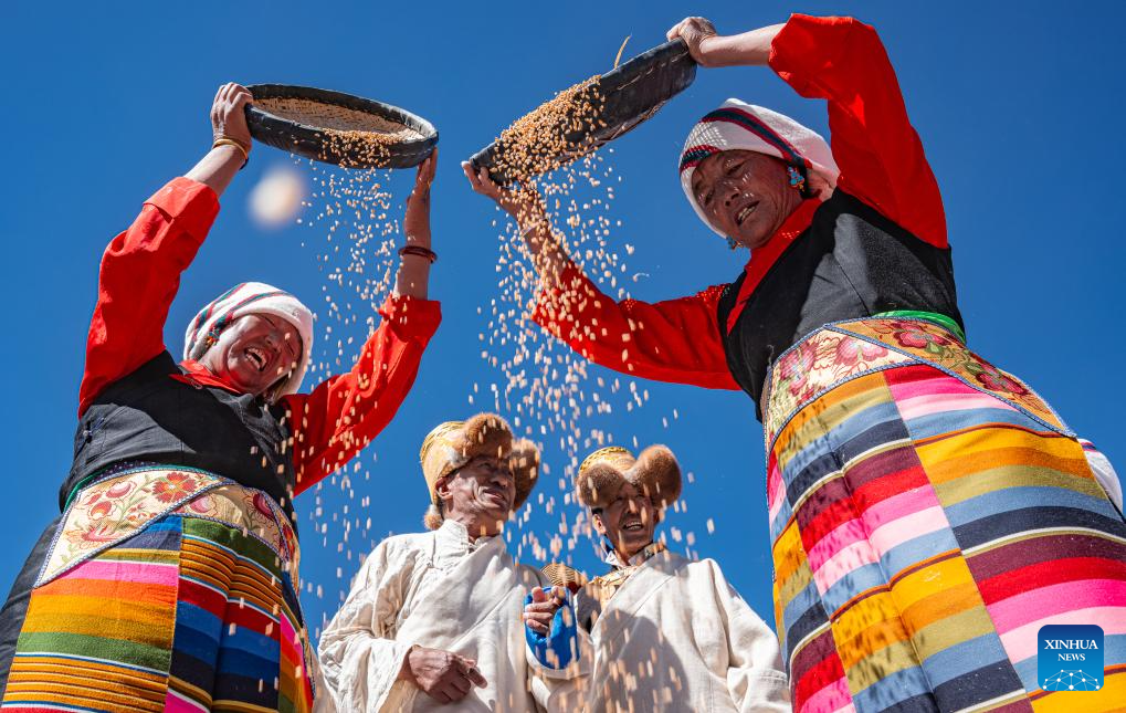 Farmers thresh the highland barley in a traditional way in Lhunzhub County, southwest China's Xizang Autonomous Region, Sept. 23, 2025.