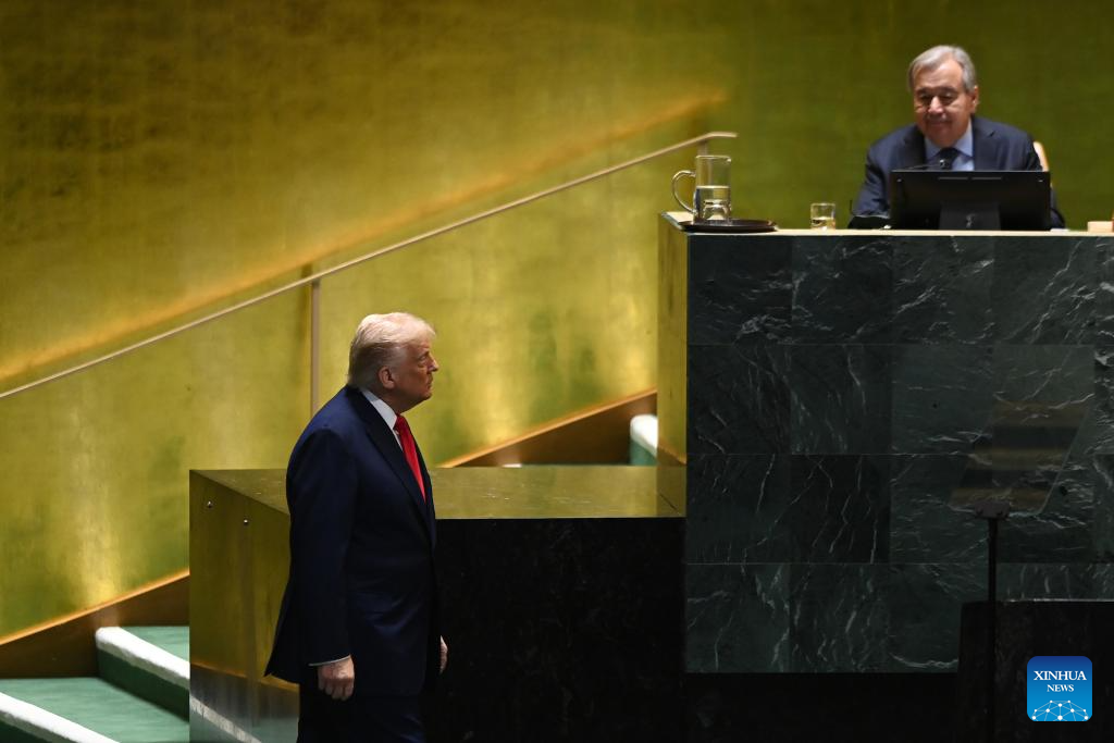 U.S. President Donald Trump (L) heads to the podium to deliver a speech during the General Debate of the 80th session of the United Nations General Assembly (UNGA) at the UN headquarters in New York, on Sept. 23, 2025.