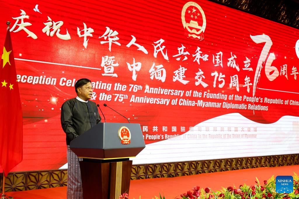 Union Minister for Ministry 1 of the President's Office U Tin Aung San speaks during a reception to celebrate the 76th anniversary of the founding of the People's Republic of China and the 75th anniversary of the establishment of diplomatic relations between China and Myanmar in Yangon, Myanmar, Sept. 24, 2025. The Chinese Embassy in Myanmar held the reception here on Wednesday. (Xinhua/Myo Kyaw Soe)