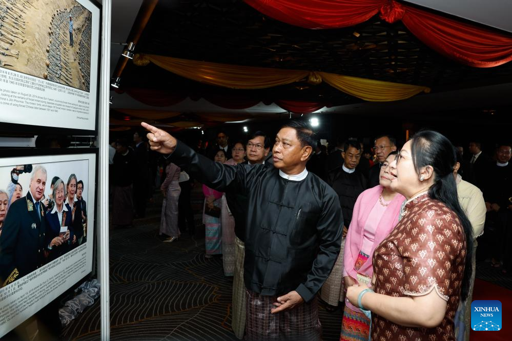 Chinese Ambassador to Myanmar Ma Jia (R, front) and Union Minister for Ministry 1 of the President's Office U Tin Aung San (L, front) attend a reception to celebrate the 76th anniversary of the founding of the People's Republic of China and the 75th anniversary of the establishment of diplomatic relations between China and Myanmar in Yangon, Myanmar, Sept. 24, 2025. The Chinese Embassy in Myanmar held the reception here on Wednesday. (Xinhua/Myo Kyaw Soe)