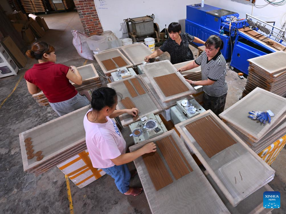 Staff members of an incense-making enterprise make incense sticks in Laidian Town, Xianyou County of southeast China's Fujian Province, on Sept. 24, 2025. Xianyou County is a significant trading and distribution center for agarwood and sandalwood in China. In recent years, the county has been working on the development of its incense-related business by leveraging the abundance in raw materials, a mature incense-making industrial chain, and online and offline sales networks there.