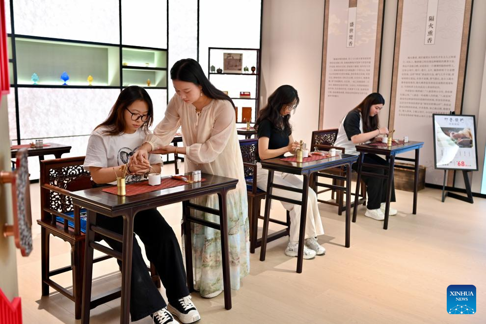Women try incense-making under the guidance of a staff member at an agarwood museum in Xianyou County, southeast China's Fujian Province, on Sept. 24, 2025. Xianyou County is a significant trading and distribution center for agarwood and sandalwood in China. In recent years, the county has been working on the development of its incense-related business by leveraging the abundance in raw materials, a mature incense-making industrial chain, and online and offline sales networks there.