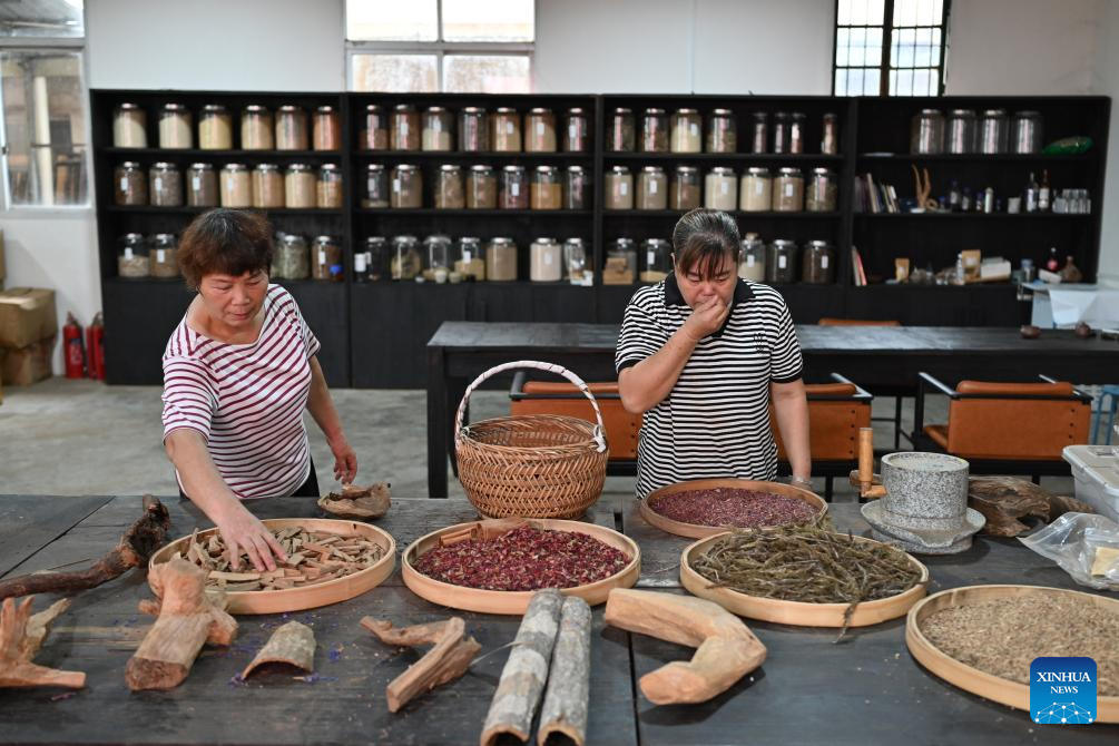 Staff members of an incense-making enterprise select raw materials for natural incense products in Laidian Town, Xianyou County of southeast China's Fujian Province, on Sept. 24, 2025. Xianyou County is a significant trading and distribution center for agarwood and sandalwood in China. In recent years, the county has been working on the development of its incense-related business by leveraging the abundance in raw materials, a mature incense-making industrial chain, and online and offline sales networks there.