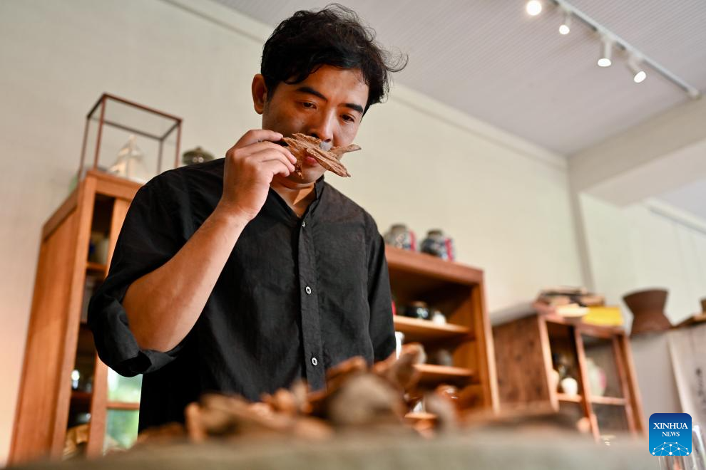 Chen Bin, an incense-making artisan, selects agarwood raw material for production of natural incense in Xianyou County, southeast China's Fujian Province, on Sept. 24, 2025. Xianyou County is a significant trading and distribution center for agarwood and sandalwood in China. In recent years, the county has been working on the development of its incense-related business by leveraging the abundance in raw materials, a mature incense-making industrial chain, and online and offline sales networks there.
