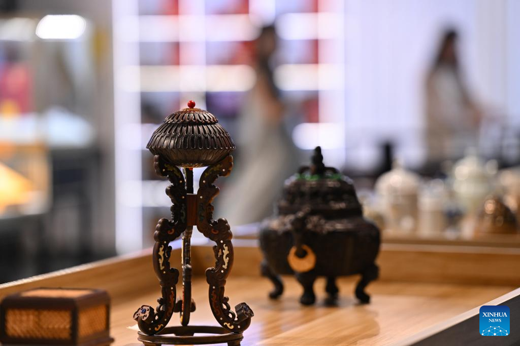 This photo taken on Sept. 24, 2025 shows an incense burner handicraft made of rosewood at an agarwood museum in Xianyou County, southeast China's Fujian Province. Xianyou County is a significant trading and distribution center for agarwood and sandalwood in China. In recent years, the county has been working on the development of its incense-related business by leveraging the abundance in raw materials, a mature incense-making industrial chain, and online and offline sales networks there.