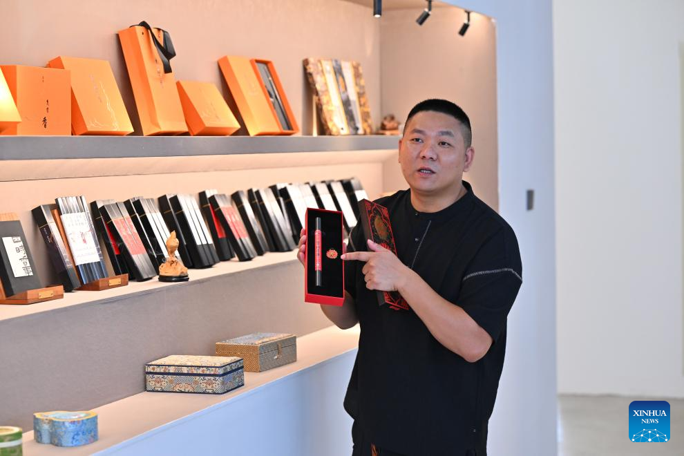 The person in charge of an incense-making enterprise introduces cultural and creative products of natural incense in Xianyou County, southeast China's Fujian Province, on Sept. 24, 2025. Xianyou County is a significant trading and distribution center for agarwood and sandalwood in China. In recent years, the county has been working on the development of its incense-related business by leveraging the abundance in raw materials, a mature incense-making industrial chain, and online and offline sales networks there.